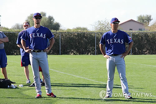 | △ MLB 텍사스 일본인 투수 다르빗슈와 후지카와 (서프라이즈<미국 애리조나주>=연합뉴스) 장현구 특파원 = 미국프로야구(MLB) 텍사스 레인저스에서 뛰는 일본인 투수 다르빗슈 유(왼쪽)와 후지카와 규지가 22일(현지시간) 미국 애리조나주 서프라이즈 스타디움에서 스프링캠프 훈련을 준비하고 있다. 2015.2.23 cany9900@yna.co.kr |