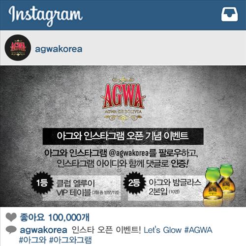 에너지 음료와 섞어 마시는 칵테일로 유명한 코카잎 리큐르 아그와는 인스타그램(@agwakorea)을 팔로우한 뒤 페이스북 이벤트 게시물에 댓글과 본인의 아이디를 올린 고객을 대상으로 추첨을 실시해 30만원 상당의 클럽 엘루이 VIP테이블(1명)과 아그와 밤글래스 세트(10명)를 증정한다.
