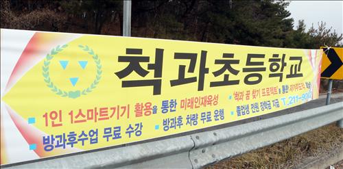 24일 울주군 범서읍 서사교 바로 옆에는 '척과초등학교'의 장점과 학생에게 주는 혜택을 써놓은 현수막이 한 달째 걸려 있다.