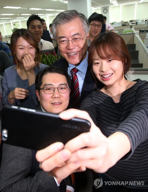 | △ 문재인 대표 '직장인들과 찰칵' (성남=연합뉴스) 신영근 기자 = 24일 오후 정보통신기술(ICT) 선도기업 방문에 나선 새정치민주연합 문재인 대표가 경기도 성남의 한 전자결재 회사에서 직원들과 함께 사진을 찍으며 미소 짓고 있다. 2015.2.24 drops@yna.co.kr http://blog.yonhapnews.co.kr/geenang |