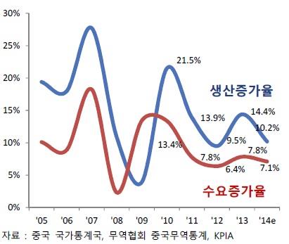 석유화학 제품의 주요 수요 산업인 플라스틱제품, 자동차, 화학섬유 부문의 중국 내 생산증가율은 2009년부터 2012년까지 두 자릿수를 기록하다 지난해 7% 안팎으로 하락했다. 중국의 성장률 둔화는 자급률 상승과 맞물린다.