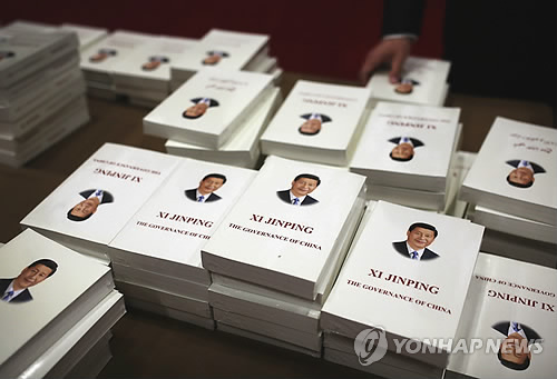 | △ 시진핑(習近平) 중국 국가주석의 어록이 담긴 책 '시진핑 국가통치(치국이정)를 말하다'의 영문판이 지난해 11월 베이징에서 열린 아시아태평양경제협력체(APEC) 회의 기간 중 기자실에 전시돼 있다. (AP=연합뉴스 자료사진) |
