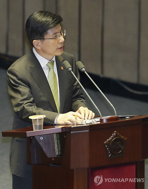| △ 본회의 출석한 황교안 장관 (서울=연합뉴스)이상학 기자 = 황교안 법무부 장관이 25일 오전 국회에서 열린 정치·외교·통일·안보 분야 대정부 질문에서 의원들의 질문에 답하고 있다 |