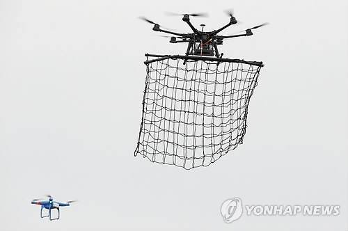 | △ 지난 9일 프랑스에서 무인기(드론)를 요격하는 무인기 'MP200'을 시연하는 모습.(AP=연합뉴스 자료사진) |