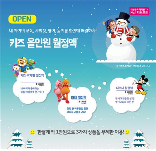 키즈 올인원은 기존 `명품 키즈 무제한 월정액(월 5천원)'과 `EBS 키즈 월정액(월 3천원)', `디즈니 월정액(월 3천원)' 모두를 2개 가격인 월 1만원에 이용할 수 있는 상품이다.