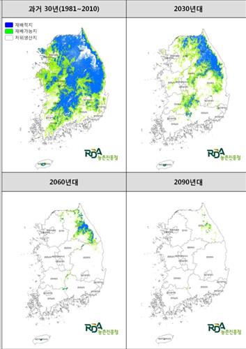 사과 재배 적지와 재배 가능지는 과거 30년 동안의 재배 면적과 비교해 앞으로모두 빠르게 줄고, 21세기 말에는 강원도 일부에서만 생산될 것으로 예상됐다.