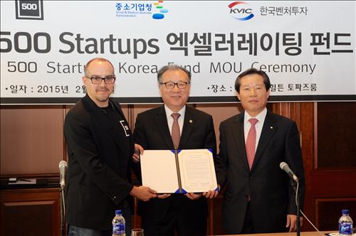 중소기업청과 한국벤처투자는 미국 실리콘밸리의 엑셀러레이터인 500스타트업스(500 Startups)와 함께 26일 오전 밀레니엄서울힐튼호텔에서 100억원 규모의 엑셀러레이팅 펀드를 조성하는 업무협약(MOU)을 맺었다.