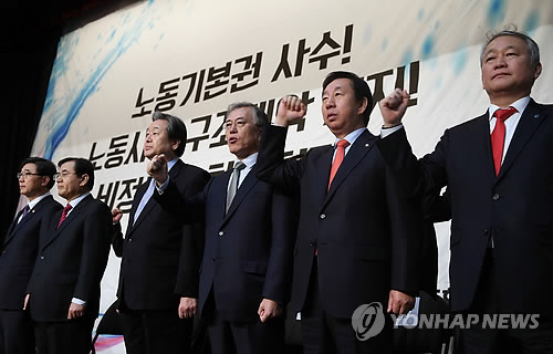 | △ 한국노총 정기대의원대회 (서울=연합뉴스) 이지은 기자 = 26일 오후 서울 서초구 우면동 한국교총회관 컨벤션홀에서 열린 한국노총 정기대의원대회에서 내빈들이 '임을 위한 행진곡'을 부르고 있다. 왼쪽부터 이기권 고용노동부 장관, 김대환 노사정위원장, 새누리당 김무성 대표, 새정치민주연합 문재인 대표, 새누리당 김성태 의원, 안양옥 한국교원단체총연합회장. |