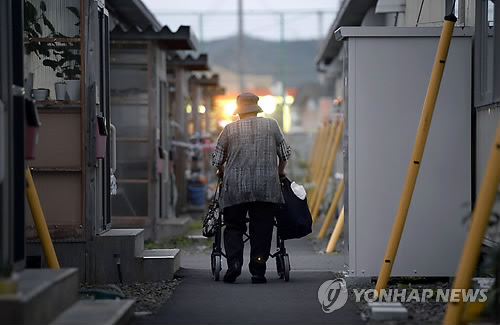 | △ (교도=연합뉴스)2014년 9월 일본 미야기 현의 한 가설주택 단지에서 걸어가는 노인의 모습. |