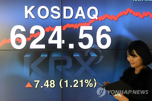 | △ 코스닥, 6년8개월 최고치 (서울=연합뉴스) 최재구 기자 = 27일 서울 여의도 KRX한국거래소에서 관계자가 코스닥 모니터 앞을 지나고 있다. 이날 코스닥지수는 전 거래일보다 7.48포인트(1.21%) 오른 624.56으로 거래를 마쳐, 지난 2008년 6월 11일(종가 628.67) 이후 최고치를 갈아치웠다. |