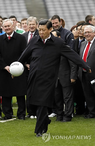 | △ 2012년 2월 국가 부주석 신분으로 아일랜드를 방문했을 때 한 축구장에서 구두를 신은 채 킥 시범을 보이고 있는 시진핑 주석(AP=연합뉴스DB) |