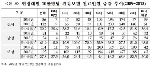 2009~2013년 인구 10만명당 진료 인원은 여성의 경우 30대에서 4.5% 소폭 증가했으며 40대에서는 오히려 4.4% 줄었다. 반면 남성은 각각 20대 100%, 30대 70% 크게 늘었다.