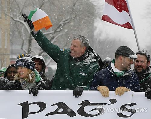 더블라지오 시장은 17일 맨해튼에서 열릴 성 패트릭스데이 퍼레이드를 앞두고 이날 뉴욕 퀸스에서 진행된 '모두를 위한 성 패트릭스데이' 퍼레이드에 참가했다.