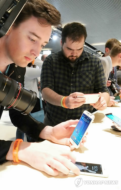 | △ 갤럭시S6 체험해보는 관람객들 (서울=연합뉴스) 삼성전자가 1일(현지시각) 스페인 바르셀로나 컨벤션센터(CCIB)에서 '삼성 갤럭시 언팩 2015'를 개최, 전략 스마트폰 '갤럭시S6'와 '갤럭시 S6 엣지'를 공개한 가운데 언팩 행사를 찾은 관람객들이 제품을 살펴보고 있다. 2015.3.2 << 삼성전자 제공 >> photo@yna.co.kr |