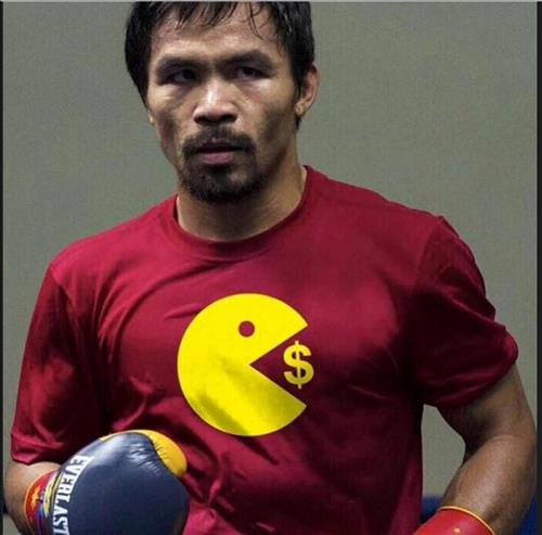 '팩맨' 파키아오가 '머니(돈)' 메이웨더를 꺾겠다는 의지를 티셔츠 그림으로 표현한 것이다.