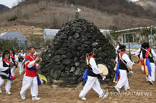 | △ 대보름 악귀쫓는 탑신제 (옥천=연합뉴스) 박병기 기자 = 충북 옥천의 마티마을 주민들이 정월대보름 건강과 풍년을 비는 탑신제를 올리고 있다. 마한시대부터 전해오는 이 풍습은 충북도 민속자료 1호로 지정돼 있다. <<연합뉴스 DB>> |
