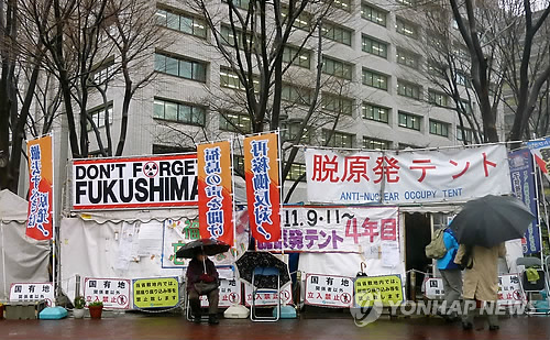 | △ 원전에 반대하는 시민단체가 일본 경제산업성 앞에 설치한 '탈(脫)원전 텐트'(교도=연합뉴스DB) |