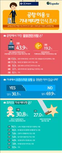 '공항에서 가장 꼴불견인 승객'이란 질문에 43.9%가 '항공사 등 공항직원에게 무례하게 굴거나 규정사항을 지키지 않아 수속을 지연시키는 승객'이라고 답변했다.
