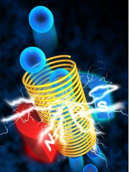 | △ 에너지분야 학술지 '나노에너지'(Nano Energy) 1월호 표지로 실린 공기방울 발전기. 외부 자기장으로 자석이 된 자기유체 속을 공기방울이 지나가면 유체에 분산돼 있는 산화철 입자가 움직이면서 자기장에 변화가 생기고, 전자기장의 변화는 전자를 유도해 주위을 둘러싼 코일에서 전기가 생산된다. |
