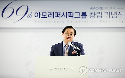 | △ 서경배 회장 "아름다움 창조해 글로벌로 도약해야" (서울=연합뉴스) 서경배 아모레퍼시픽그룹 회장이 5일 서울 중구 청계천로 아모레퍼시픽 본사에서 열린 창립 69주년 기념식에서 "우리는 지금 미지의 아름다움을 창조해 글로벌로 도약해야 하는 선택의 갈림길에 서 있다"고 말했다. 2014.9.5 << 아모레퍼시픽그룹 제공 >> photo@yna.co.kr |