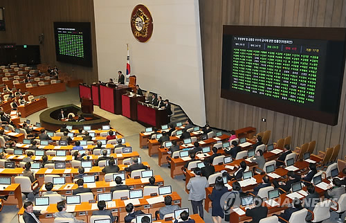 | △ '김영란법' 국회 본회의 통과 (서울=연합뉴스) 진성철 기자 = 3일 국회 본회의에서 '김영란법'으로 불리는 부정청탁·금품수수금지법 제정안이 통과되고 있다. 제정안은 재석 의원 247명 가운데 찬성 226명, 반대 4명, 기권 17명으로 가결됐다. |