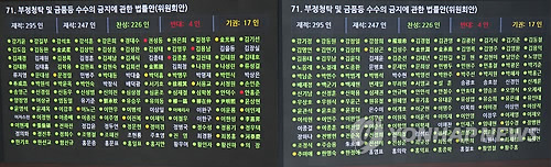 | △ '김영란법' 국회 본회의 통과 (서울=연합뉴스) 이상학 기자 = 3일 오후 국회에서 열린 제331회 국회(임시회) 제8차 본회의에서 '부정청탁 및 금품 등 수수의 금지에 관한 법률안'이 통과되고 있다. 전광판 투표 결과. |