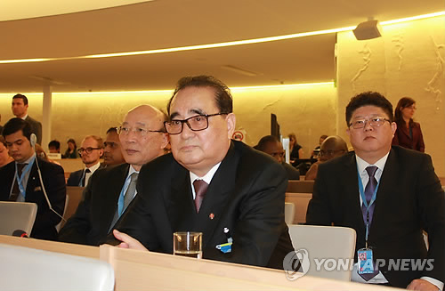 | △ 남북, 유엔 인권이사회서 北 인권 놓고 격돌 (제네바=연합뉴스) 류현성 특파원 = 남북이 3일(현지시간) 스위스 제네바 유럽 유엔본부에서 열린 제28차 유엔 인권이사회에서 북한 인권문제를 둘러싸고 격돌했다. 사진은 북한 리수용 외무상이 유엔 인권이사회에서 기조연설을 앞두고 자리에 앉아 있는 모습. 2015.3.4 rhew@yna.co.kr |