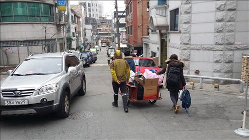 그는 친구 2명과 함께 앞뒤로 손수레를 밀며 구불구불 골목길을 따라 올라갔다. 과속방지턱이 나올 때마다 '덜컹'하고 짐 위에 올려놓은 옷가지나 우산이 땅에 떨어졌지만 친구들이 잽싸게 주워담았다.