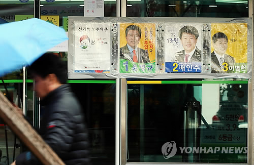 | △ '썰렁한' 조합장 동시선거 (광주=연합뉴스) 박철홍 기자 = 3·11 전국 조합장 동시선거 선거운동 일주일째인 4일 오전 제약이 많은 선거운동 규정 탓에 비교적 차분한 분위기가 이어지고 있다. 사진은 3일 오후 광주 서구의 한 농협 앞이 후보자의 벽보만 붙여있을뿐 비교적 썰렁한 모습을 보이는 모습. 2015.3.4 pch80@yna.co.kr |