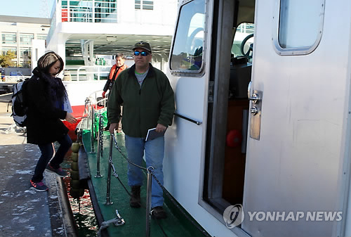 | △ 미국 FDA, 패류수출 지정해역 현장 점검 시작 (통영=연합뉴스) 김재홍 기자 = 굴 등 패류의 대미 수출 지속 여부를 결정하는 미국 식품의약국(FDA) 점검단(단장 윌리엄 버크하트)이 4일 경남 통영에서 현장 점검을 시작했다. 윌리엄 버크하트 단장이 이날 오전 통영항여객터미널 부두에서 행정선에 승선하고 있다. 2015.3.4 pitbull@yna.co.kr |