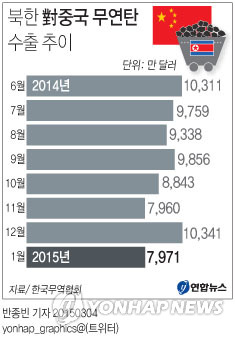 북한의 주요 대중 수출품인 이들 광물의 수출이 급감하면서 북한의 1월 대중 수출액은 모두 1억8천485만 달러로, 작년 동기보다 16.9% 감소했다.