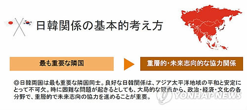 일본 외무성은 홈페이지의 한국 개황 항목과 '최근의 일한관계' 항목에서 '우리나라(일본)와 자유와 민주주의, 시장경제 등의 기본적 가치를 공유하는 중요한 이웃나라'라는 종전 한국 소개 문구를 '가장 중요한 이웃나라'로 최근 대체한 것으로 확인됐다.
