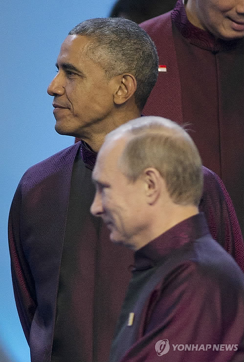 | △ 버락 오바마 미국 대통령이 우크라이나 사태와 관련 러시아에 취한 제재 조치를 1년 더 연장하기로 결정한 것으로 알려졌다. 사진은 블라디미르 푸틴 러시아 대통령(앞쪽)과 버락 오바마 미국 대통령 (AP=연합뉴스 자료사진) |