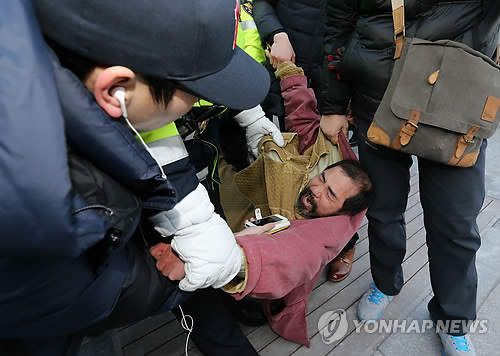 | △ 경찰차로 이송되는 리퍼트 미 대사 습격 괴한 (서울=연합뉴스) 김주성 기자 = 5일 오전 서울 세종문화회관에서 열린 민화협 주최 초청 강연에서 마크 리퍼트 주한 미국대사를 습격한 용의자가 경찰차로 이송되고 있다. |