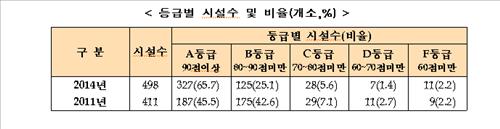 중간 등급인 B, C 등급을 받은 시설은 각각 125곳, 28곳이며 하위 등급인 D, F 등급을 받은 시설은 각각 7곳, 11곳으로 나타났다.