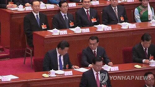 | △ 리커창, 시진핑 지적에 '엄격한 당관리' 업무보고에 추가 (베이징=연합뉴스) 시진핑(習近平) 중국 국가주석이 추진 중인 이른바 '4대 전면'(全面) 정책 가운데 하나인 '엄격한 당 관리'가 리커창(李克强) 총리의 정부 업무보고에서 빠졌다가 즉석에서 급히 포함된 것으로 확인됐다. 사진은 시 주석이 5일 전국인민대표대회 개막식 시작 전에 옆에 앉아 있던 리 총리에게 무언가 이야기를 하는 모습. 2015.3.5 << 연합뉴스TV >> jsa@yna.co.kr |