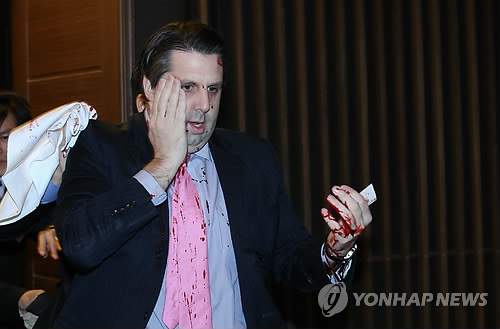 | △ 마크 리퍼트 주한 미대사가 5일 오전 서울 세종문화회관에서 열린 민화협 주최 초청 강연에 참석했다가 김기종(우리마당 대표)씨로부터 공격을 받고 피를 흘리며 행사장을 빠져나가고 있다. |