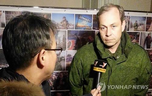 | △ (모스크바=연합뉴스) 유철종 특파원 = 도네츠크주 분리주의 세력이 자체 선포한 '도네츠크인민공화국' 국방부 대변인 에두아르트 바수린이 5일(현지시간) 도네츠크 시내 국방부 브리핑실에서 연합뉴스와 인터뷰하고 있다. 바수린은 "현재까진 대부분의 지역에서 휴전이 지켜지고 있지만 민스크 협정이 완전한 평화로 이어질 지는 아직 미지수"라고 말했다. 2015.3.6 cjyou@yna.co.kr |