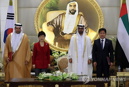 | △ 한·UAE 양해각서 서명식 (아부다비=연합뉴스) 도광환 기자 = 박근혜 대통령과 모하메드 빈 자이드 알 나흐얀 아부다비 왕세제가 참석한 가운데 5일 오후(현지시간) 아랍에미리트 아부다비 알-무슈리프 궁에서 열린 협정서명식에서 윤상직 산업통상자원부 장관, 칼둔 알 무바라크 아부다비 행정청장이 '원전사업 공동진출 양해각서(MOU)'에 서명한 뒤 기념촬영하고 있다. |