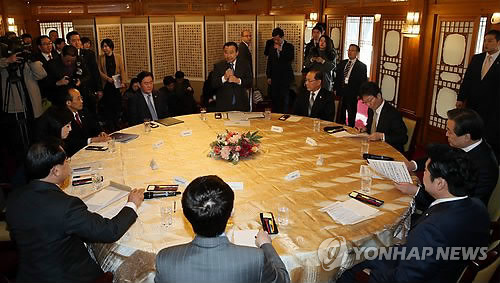 | △ 고위당정청 첫 회의 (서울=연합뉴스) 전수영 기자 = 이완구(가운데) 국무총리가 6일 오전 서울 삼청동 총리공관에서 열린 첫 고위당정청 회의에서 모두발언을 하고 있다. 이완구 국무총리, 새누리당 김무성 대표와 유승민 원내대표, 청와대 이병기 비서실장 등 여권 수뇌부 4인이 한자리에 모이는 것은 진용 개편 후 이번이 처음이다. |