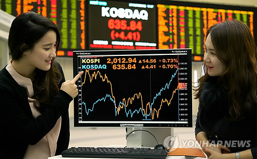| △ 코스피 코스닥 나란히 연고점 (서울=연합뉴스) 6일 코스피와 코스닥이 나란히 연중 최고치를 기록했다. 코스피지수는 전날보다 14.56포인트(0.73%) 오른 2,012.94로 마감했다. 코스닥지수는 전날보다 4.41포인트(0.70%) 오른 635.84로 마감했다. 장이 마감된 이날 오후 서울 여의도 한국거래소에서 직원들이 모니터를 보며 환하게 웃고 있다. (한국거래소 제공) |