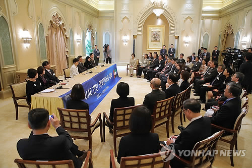 | △ 박 대통령, UAE 한인 의료인 간담회 (아부다비=연합뉴스) 이정훈 기자 = 박근혜 대통령이 6일 오후(현지시간) 아랍에미리트(UAE) 아부다비 한 호텔에서 UAE 한인 의료인과 간담회를 갖고 있다. |