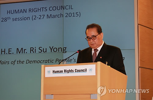 | △ 기조연설하는 북한 리수용 외무상 (제네바=연합뉴스) 류현성 특파원 = 남북이 3일(현지시간) 스위스 제네바 유럽 유엔본부에서 열린 제28차 유엔 인권이사회에서 북한 인권문제를 둘러싸고 격돌했다. 사진은 북한 리수용 외무상이 유엔 인권이사회에서 기조연설하는 모습. 2015.3.4 rhew@yna.co.kr |
