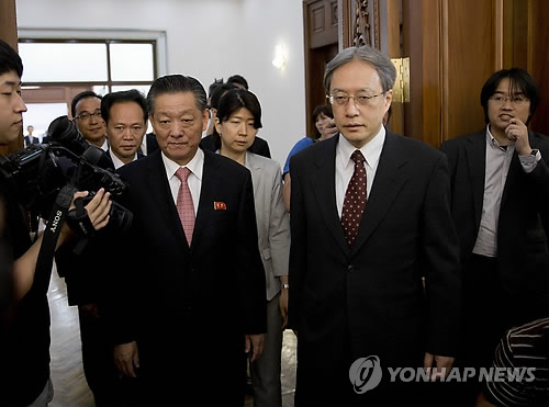 | △ 2014년 7월 1일 중국 베이징의 북한대사관에서 일본 이하라 준이치(伊原純一, 오른쪽) 외무성 아시아대양주 국장과 북한 송일호(왼쪽) 북일 국교정상화 교섭담당 대사가 납북 일본인 재조사 등을 논의하기 위해 회담장에 들어서고 있다. (AP=연합뉴스 DB) |