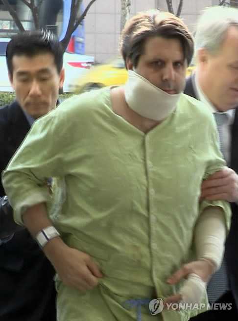 | △ 신촌 세브란스병원 들어가는 마크 리퍼트 대사 (서울=연합뉴스) 5일 오전 흉기 습격을 당한 마크 리퍼트 주한 미국 대사가 서울 서대문구 신촌세브란스 병원으로 들어가고 있다. 2015.3.5 << 연합뉴스TV >> photo@yna.co.kr |