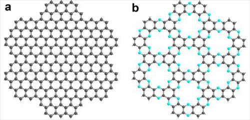 | △ 탄소 원자 6개가 6각형(벤젠고리) 평면구조를 이루고 있는 그래핀(a)과 벤젠고리 6개가 질소 원자(파란색)로 연결돼 큰 6각형 평면구조를 이루고 있는 새로운 2차원 구조체(C2N-h2D crystal)(b) |