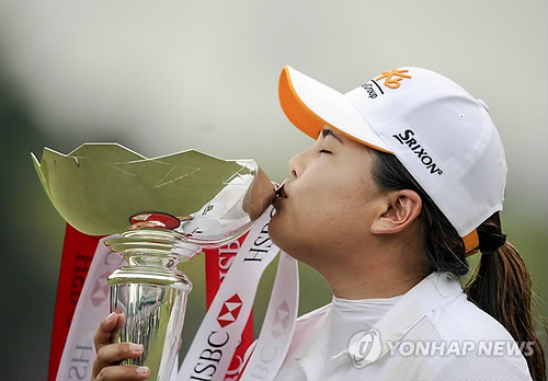 | △ 박인비가 8일 싱가포르 센토사 골프클럽에서 열린 HSBC 위민스 챔피언스 4라운드 경기를 마친 뒤 우승트로피에 입맞춤을 하고 있다. (EPA=연합뉴스) |