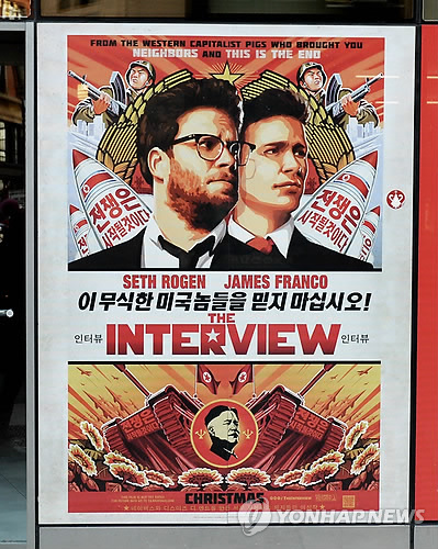 | △ epa04545099 (FILE) A file picture dated 18 December 2014 of a poster for the film 'The Interview' outside of Regal Theater in New York, New York, USA. The US government instituted new sanctions against North Korea on 02 January 2015 in response to the hacking of Sony Pictures Entertainment. The FBI last week blamed North Korea for hacking the film studio in apparent retaliation for the movie, The Interview, a comedy about the assassination of North Korean leader Kim Jong Un. EPA/JUSTIN LANE |