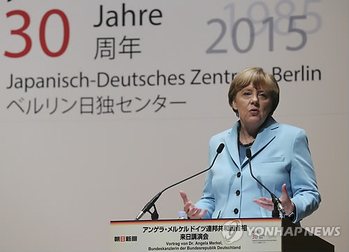 메르켈 총리는 이날 도쿄 도내에서 행한 강연 후 질의응답 시간에 '전후 70년을 맞은 일본이 역사 문제를 둘러싼 중국 및 한국과의 갈등을 어떻게 극복해야 하느냐'는 질문을 받자 "독일은 과거와 제대로 마주했다"며 "주변국의 관용도 있었다"고 소개했다고 아사히 신문 등 일본 언론이 보도했다.