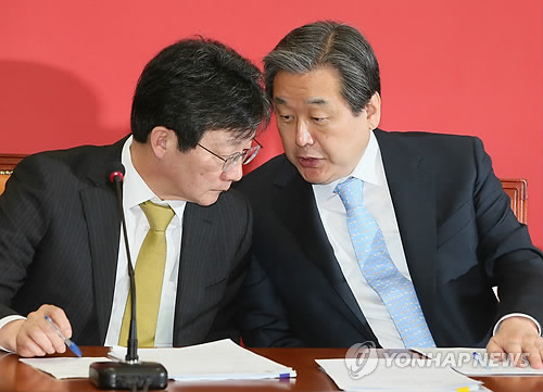 | △ 김무성 유승민 대화 (서울=연합뉴스) 진성철 기자 = 새누리당 김무성 대표(오른쪽)와 유승민 원내대표가 9일 국회에서 열린 최고위원회의에서 대화하고 있다. |